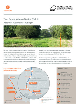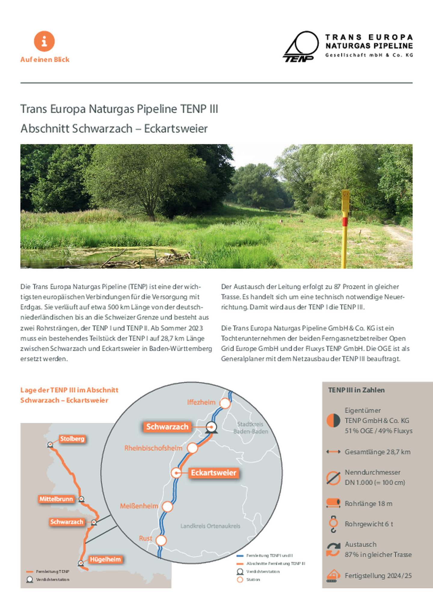 Der Austausch der Leitung erfolgt in allen Bereichen weitestgehend in gleicher Trasse. Es handelte sich um eine technisch notwendige Neuerrichtung. Damit wurde aus der TENP I die TENP III. Sie ist H2-ready. Die Inbetriebnahme erfolgte im Juli 2025.