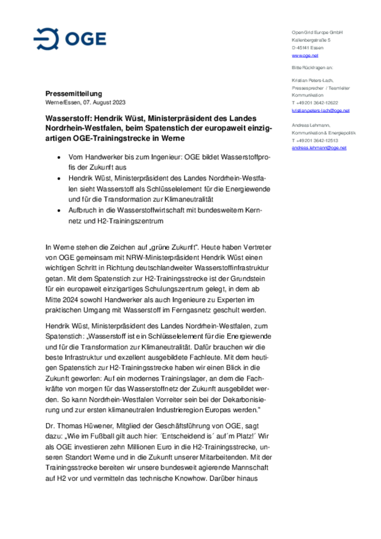 Spatenstich der H2-Trainingsstrecke der OGE in Werne am 7. August 2023