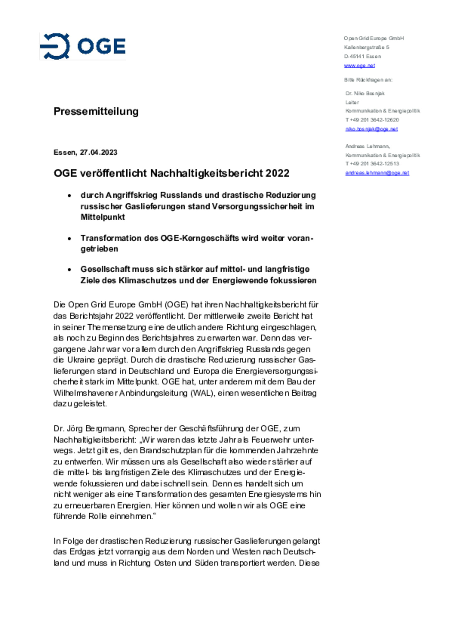 OGE veröffentlicht Nachhaltigkeitsbericht 2022