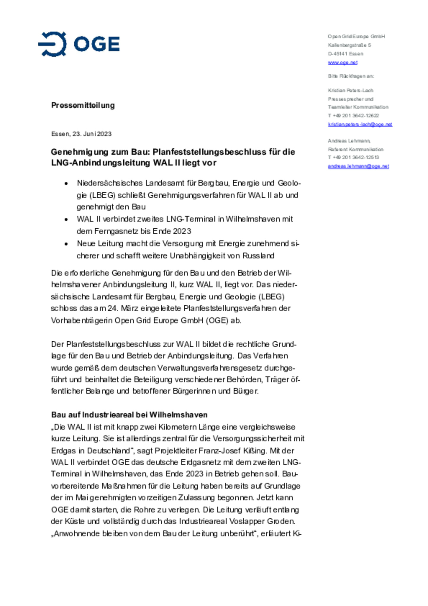 Niedersächsisches Landesamt für Bergbau, Energie und Geologie (LBEG) schließt Genehmigungsverfahren für WAL II ab und genehmigt den Bau. WAL II verbindet zweites LNG-Terminal in Wilhelmshaven mit dem… Ferngasnetz bis Ende 2023. Neue Leitung macht die Versorgung mit Energie zunehmend sicherer und schafft weitere Unabhängigkeit von Russland.
