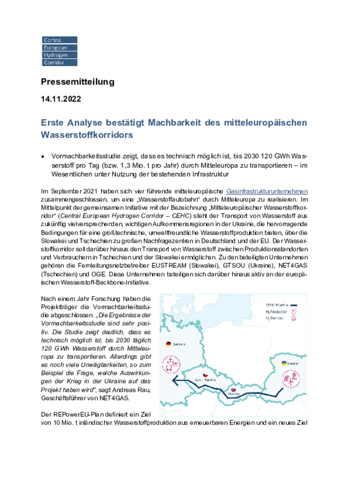 Vormachbarkeitsstudie zeigt, dass es technisch möglich ist, bis 2030 120 GWh Wasserstoff pro Tag (bzw. 1,3 Mio. t pro Jahr) durch Mitteleuropa zu transportieren – im Wesentlichen unter Nutzung der …bestehenden Infrastruktur