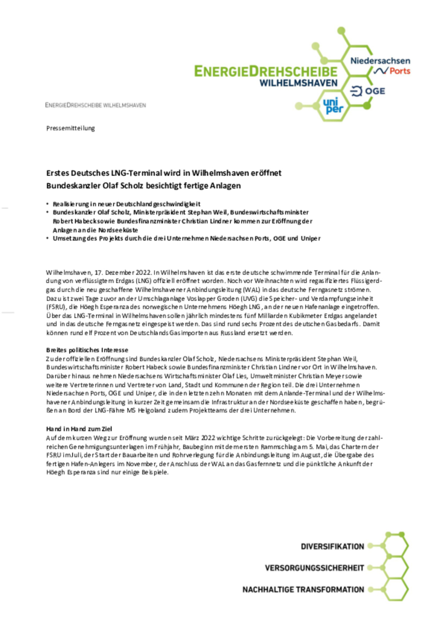 Realisierung in neuer Deutschlandgeschwindigkeit. Bundeskanzler Olaf Scholz, Ministerpräsident Stephan Weil, Bundeswirtschaftsminister Robert Habeck sowie Bundesfinanzminister Christian Lindner …kommen zur Eröffnung der Anlagen an die Nordseeküste. Umsetzung des Projekts durch die drei Unternehmen Niedersachsen Ports, OGE und Uniper.