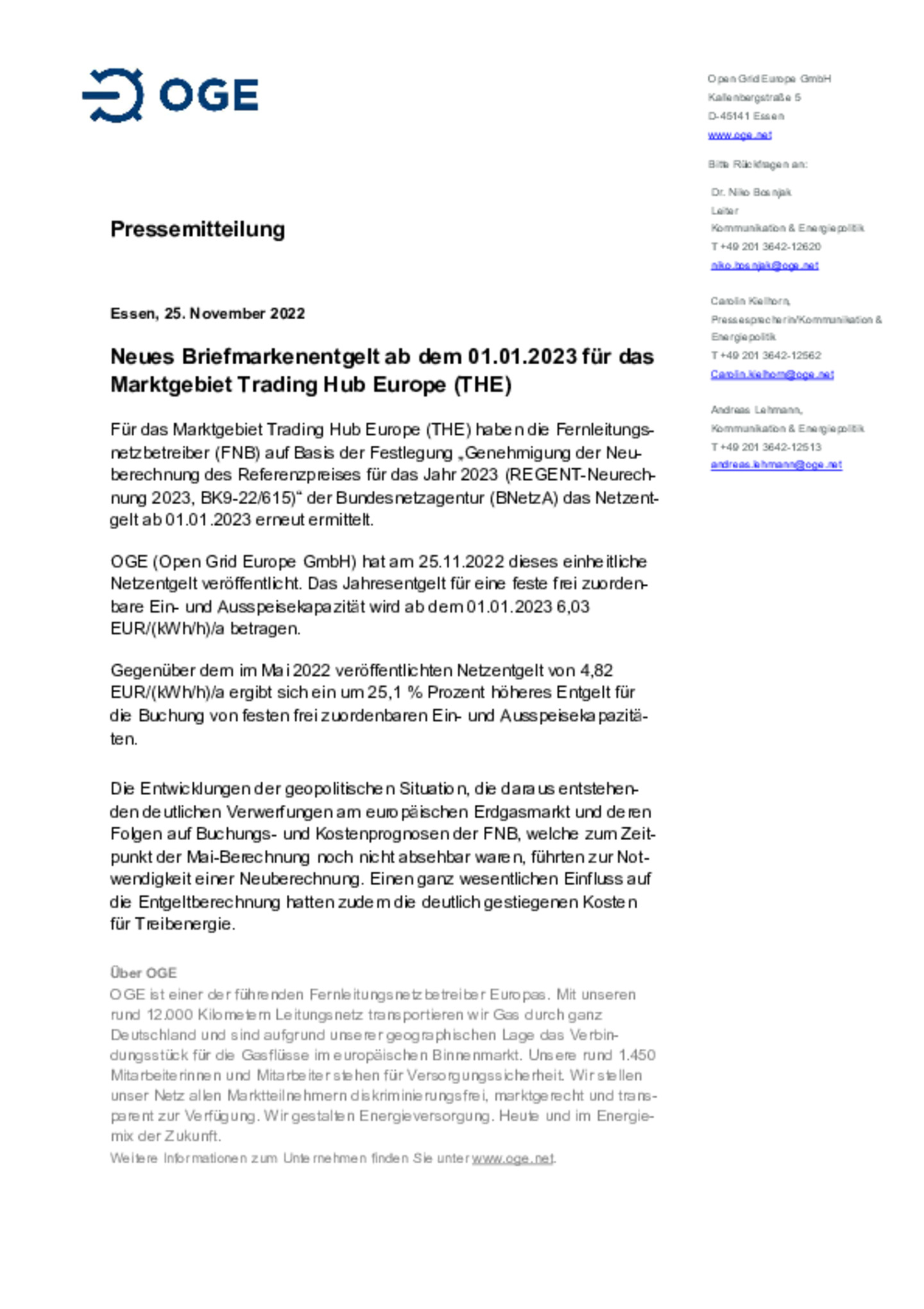 Für das Marktgebiet Trading Hub Europe (THE) haben die Fernleitungsnetzbetreiber (FNB) auf Basis der Festlegung „Genehmigung der Neuberechnung des Referenzpreises für das Jahr 2023 …(REGENT-Neurechnung 2023, BK9-22/615)“ der Bundesnetzagentur (BNetzA) das Netzentgelt ab 01.01.2023 erneut ermittelt.