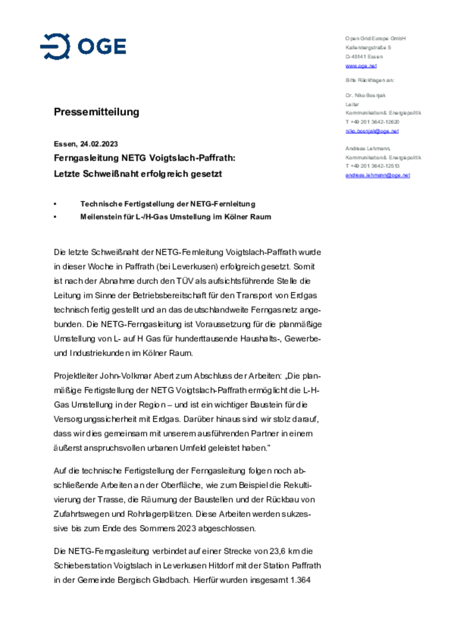 Die letzte Schweißnaht der NETG-Fernleitung Voigtslach-Paffrath wurde in dieser Woche in Paffrath (bei Leverkusen) erfolgreich gesetzt. Somit ist nach der Abnahme durch den TÜV als aufsichtsführende …Stelle die Leitung im Sinne der Betriebsbereitschaft für den Transport von Erdgas technisch fertig gestellt und an das deutschlandweite Ferngasnetz angebunden.
