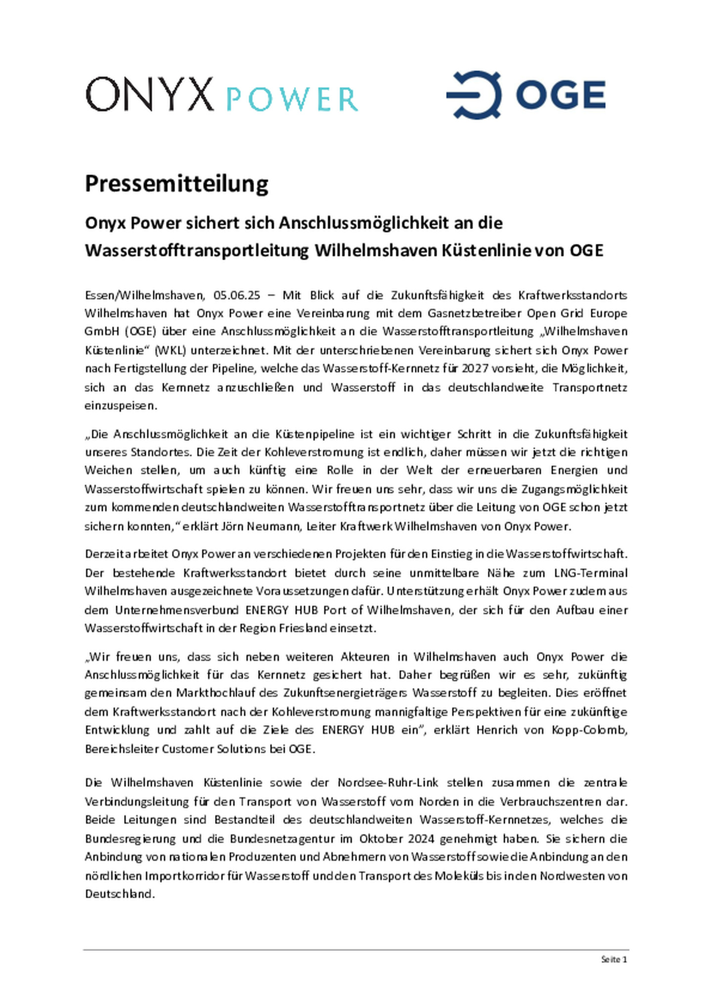 Mit Blick auf die Zukunftsfähigkeit des Kraftwerksstandorts Wilhelmshaven hat Onyx Power eine Vereinbarung mit dem Gasnetzbetreiber Open Grid Europe GmbH (OGE) über eine Anschlussmöglichkeit an die …Wasserstofftransportleitung „Wilhelmshaven Küstenlinie“ (WKL) unterzeichnet.