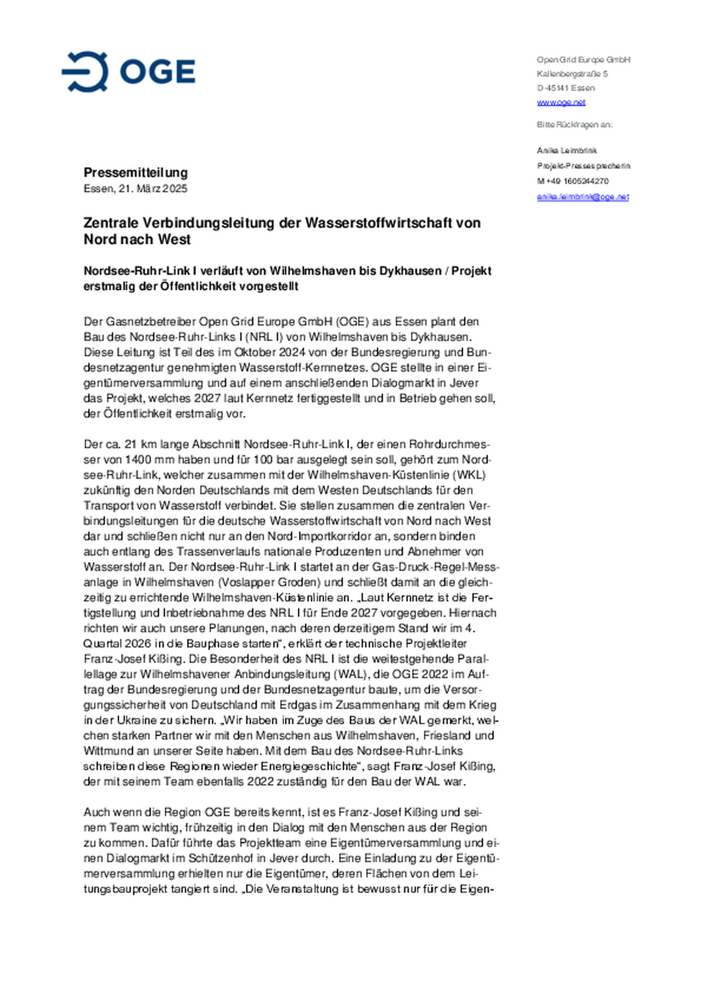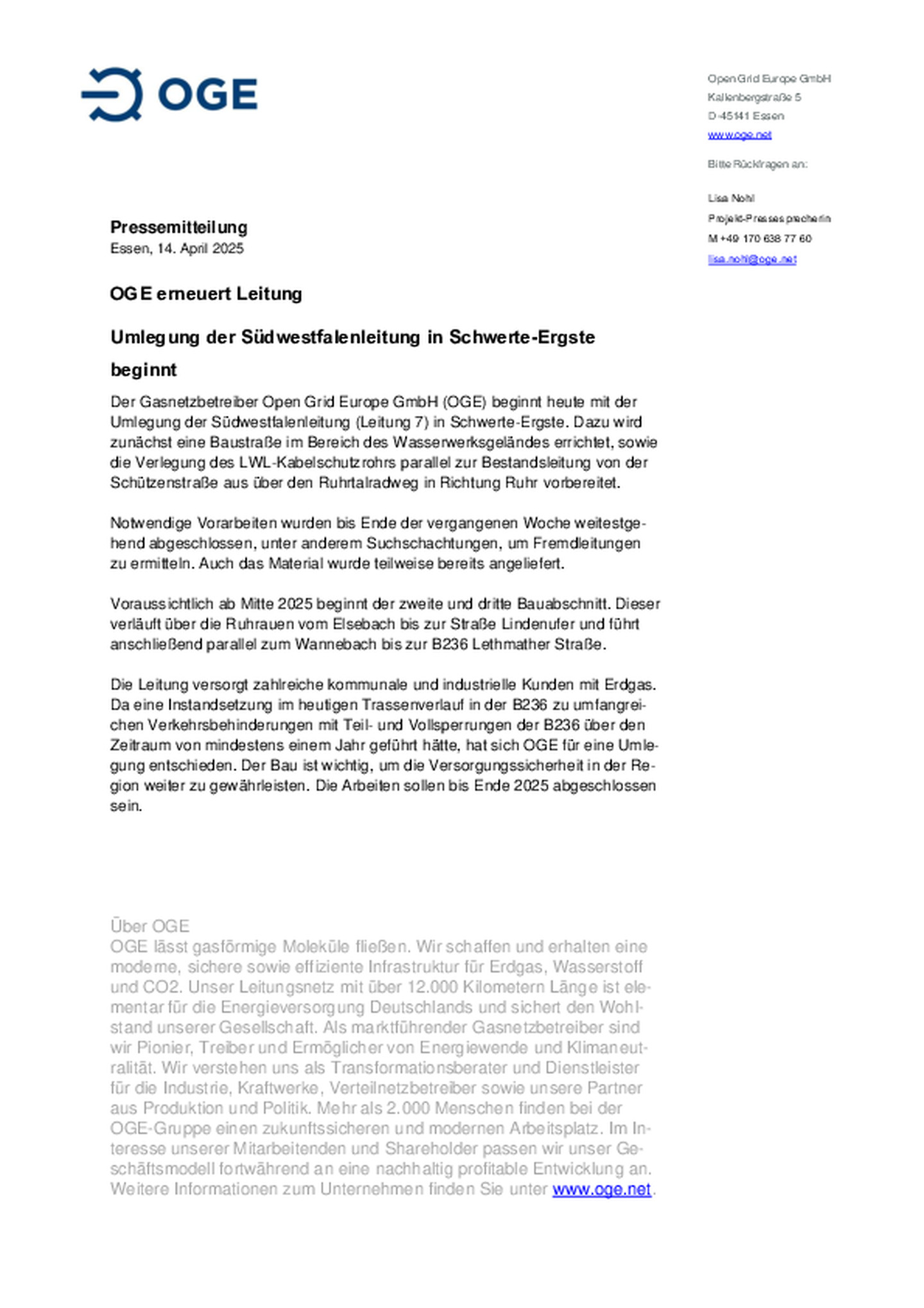 Der Gasnetzbetreiber Open Grid Europe GmbH (OGE) baut gemeinsam mit der Nowega GmbH eine neue Leitung, die zukünftig Wasserstoff transportieren wird: Die Leitung HEp verläuft zwischen Heek und Epe im… Kreis Borken.