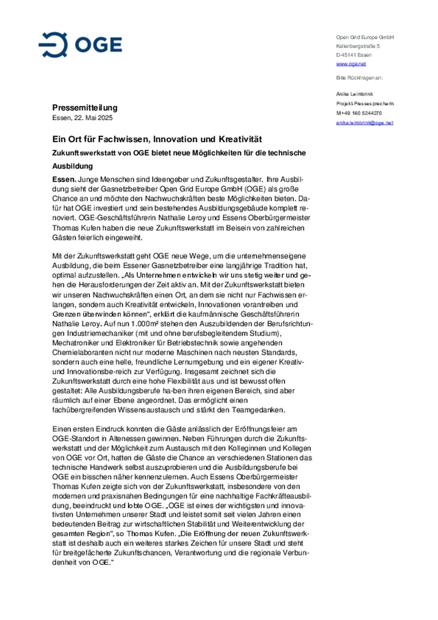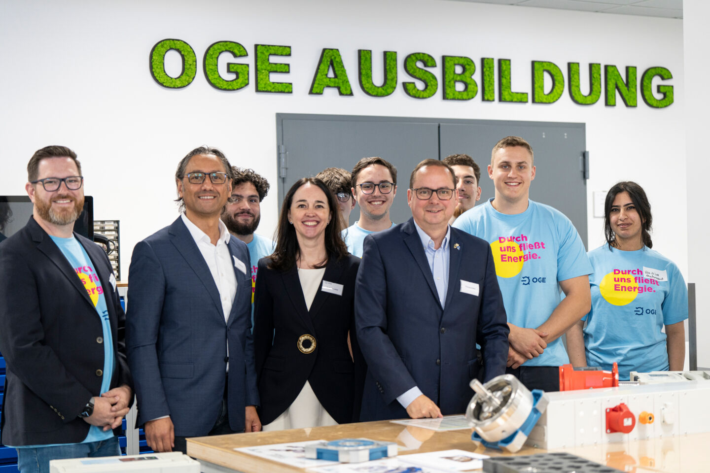 Gemeinsam mit Essens Oberbürgermeister Thomas Kufen (vorne rechts) eröffnete OGE-Geschäftsführerin Nathalie Leroy (2. v. r.), Betriebsrat Önder Ata sowie Jonas Fauser, Leiter der technischen …Ausbildung (3. u. 4. v. r.) zusammen mit aktuellen Auszubildenden von OGE und weiteren Gästen die neue Zukunftswerkstatt. Diese bietet für die technische Ausbildung neue Möglichkeiten.