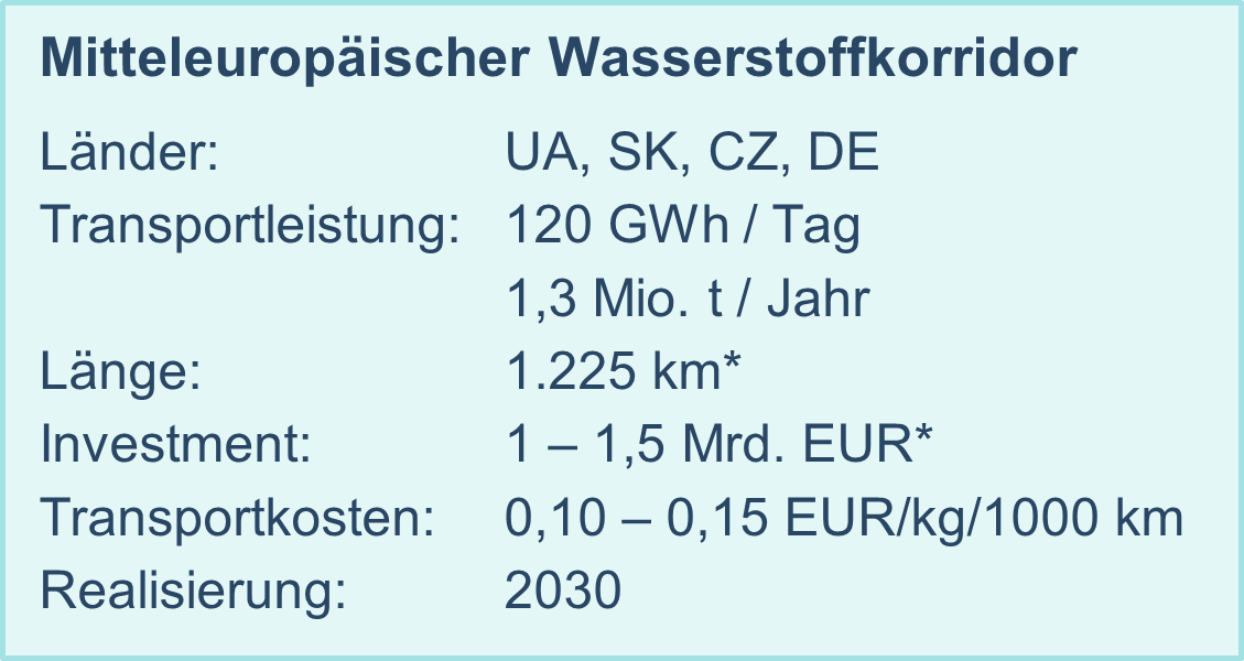 Neben der technischen Machbarkeit haben die Projektträger auch die potenziellen Kosten für die Umwidmung bestimmter Erdgasleitungen für den Wasserstofftransport in Verbindung mit gezielten Investitionen in neue Wasserstoffinfrastruktur untersucht. Rastislav Ňukovič, der Generaldirektor von EUSTREAM, erklärt: „Die erste Analyse bestätigt, dass die wichtigsten Erdgasleitungen für den Transport von reinem Wasserstoff umgewidmet werden können. Das senkt die Kosten des Gesamtprojekts erheblich.“ Der 1.225 km lange Abschnitt des mitteleuropäischen Wasserstoffkorridors von der ukrainisch-slowakischen Grenze bis zu den großen Bedarfszentren in Süddeutschland erfordert eine Gesamtinvestition von ca. 1 bis 1,5 Mrd. Euro. Diese relativ geringe Kostenschätzung umfasst die notwendige Modernisierung von Leitungen, Grenzübergangsstellen und einzelnen Verdichtereinheiten und liegt deutlich unter Kosten für den Bau einer neuen Wasserstoffinfrastruktur. Die Investitionskosten für den ukrainischen Teil des Korridors hängen von der genauen Lage der H2-Produktionsstandorte in der Ukraine ab. Die voraussichtlichen Gestehungskosten für den Wasserstofftransport werden insgesamt auf 0,10 bis 0,15 EUR/kg pro 1.000 km geschätzt, was im unteren Bereich der von der European Hydrogen Backbone Initiative geschätzten Kosten von 0,11 bis 0,21 EUR/kg pro 1000 km liegt.