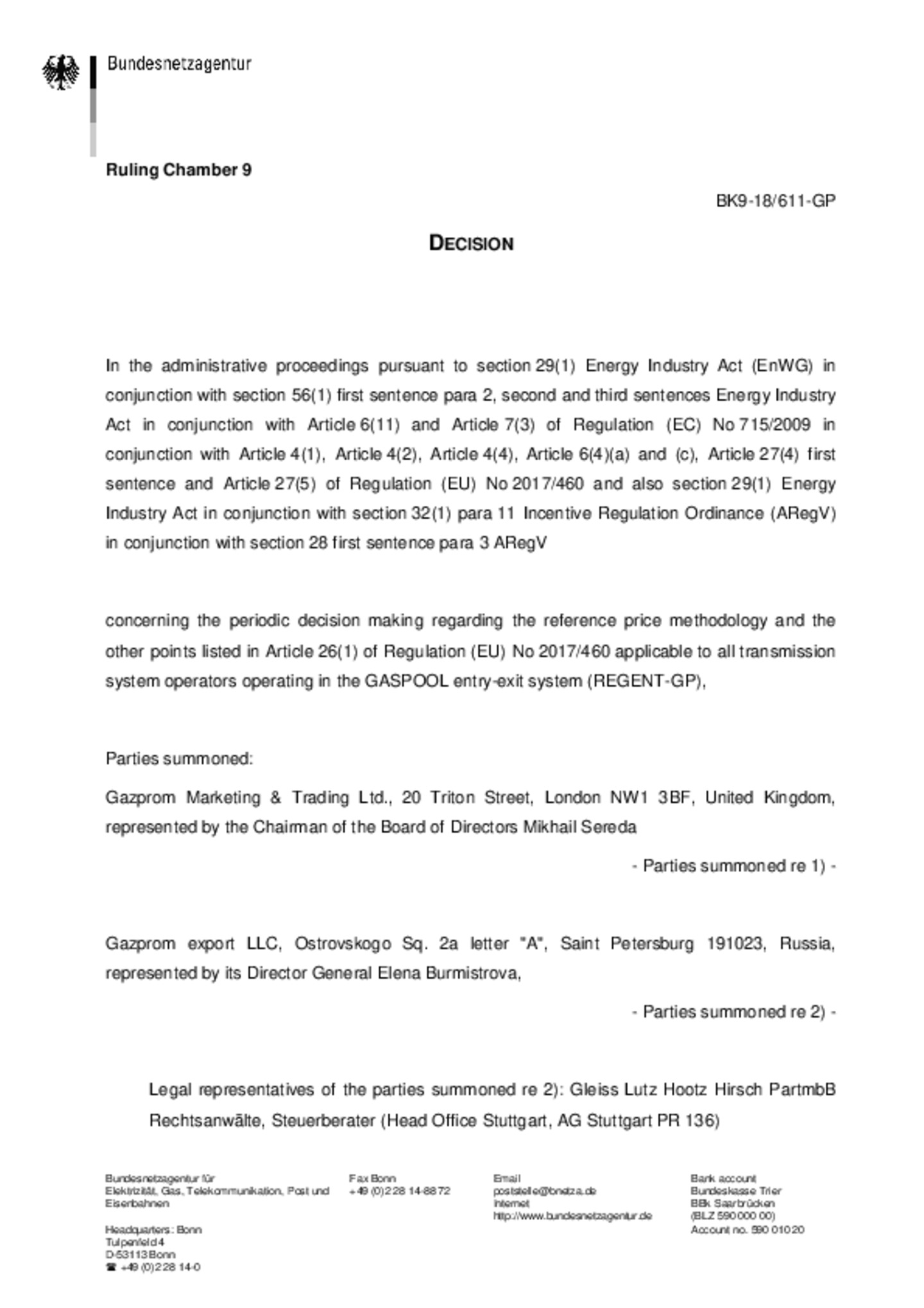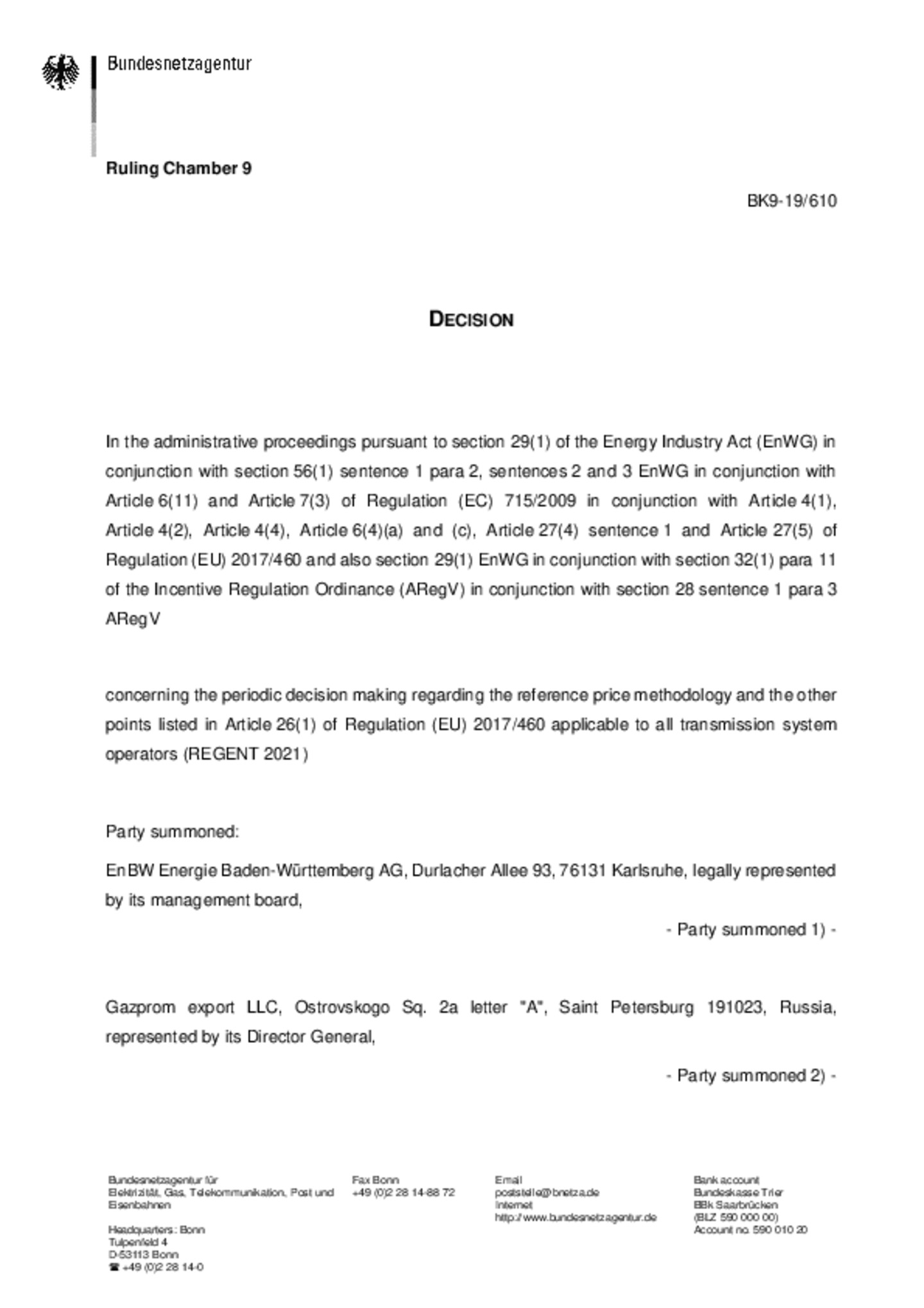 In conjunction with Art. 26 NC TAR consultation, the cost allocation test was carried out by the BNetzA. The test results, including an assessment, are published on the website of the Federal Network Agency via REGENT for the market area Trading Hub Europe (BK9-19/610) entry-exit system.
