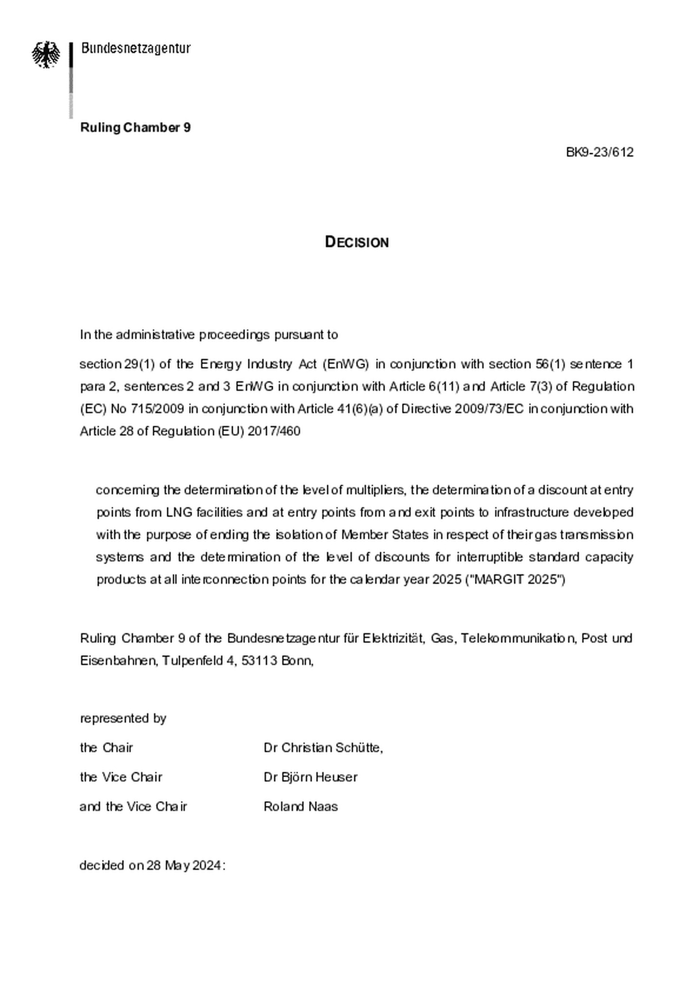 The BNetzA determined the discounts for interruptible capacity at interconnection points in its draft decision BK9-24/612 (Decision ‘MARGIT 2026’) Annex I. The methodology to calculate these discounts is described in chapter 6 of the draft decision MARGIT 2026.
