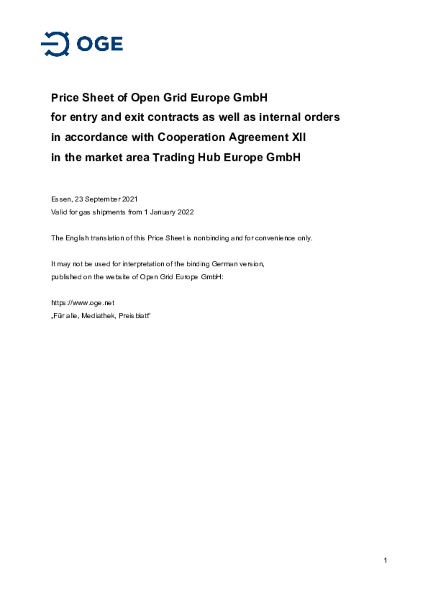 Price Sheet of Open Grid Europe GmbH for entry and exit contracts as well as internal orders in accordance with Cooperation Agreement XII in the market area Trading Hub Europe GmbH