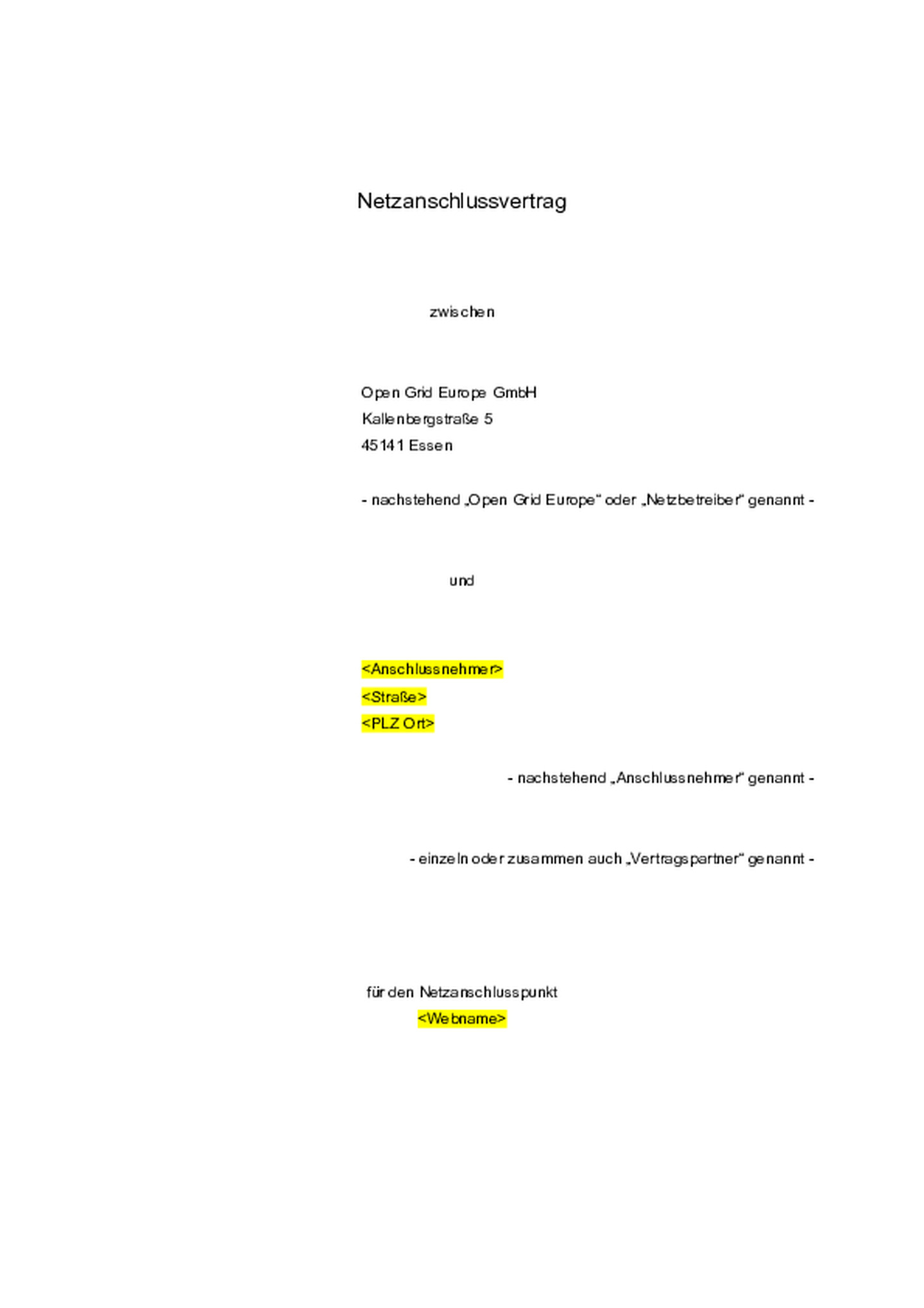 This contract governs the connection of the gas plant of the connection customer to the gas supply network of Open Grid Europe (network connection) at the connection point for the withdrawal of gas …(exit point). It contains above all provisions governing the operation of, and changes to, the gas pressure regulating and metering station assigned to the network connection point, as well as the exchange of information between the parties to the contract (only in German).