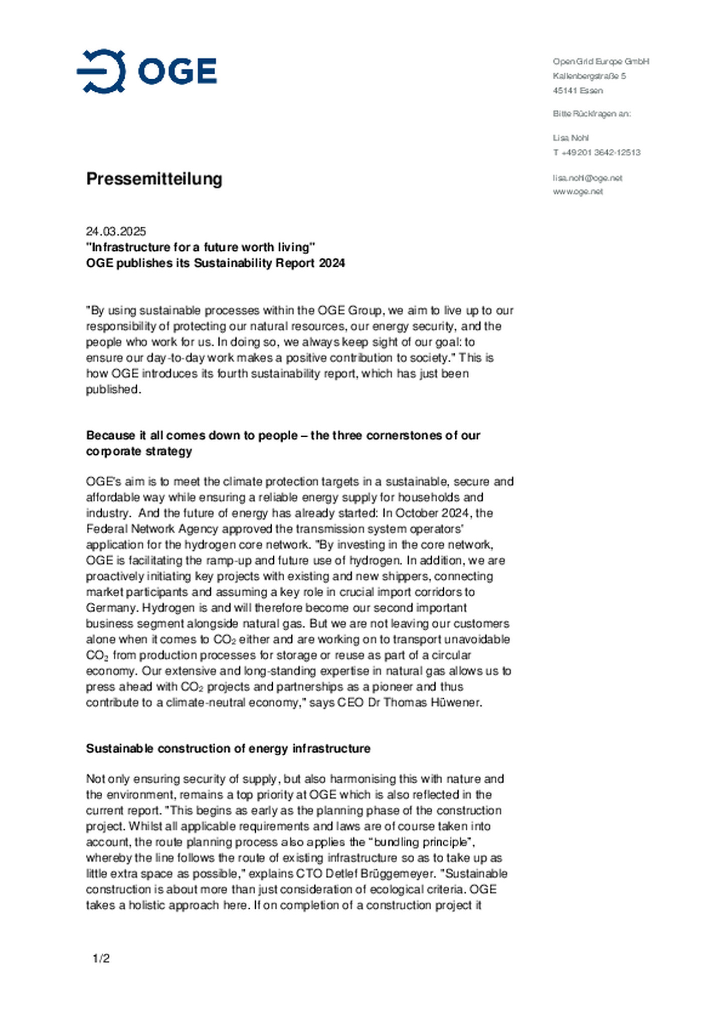 Color and inverted logo, eps and jpg / Photos of the management / Photo of the headquarter / Photos of compressor station and pipeline construction. OGE grants the users the right to use, store and …reproduce the texts, images and graphics provided in the press kit in whole or in part for journalistic purposes within the scope of the applicable press and copyright law, whereby OGE must be named as source/author. The use and reproduction of the OGE logo requires the prior consent of OGE.