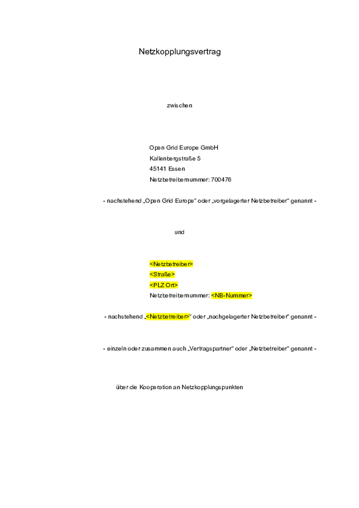 Pursuant to Article 7 of the Gas Network Access Ordinance, network operators have to sign network interconnection contracts with operators of networks to which they are connected via a network …interconnection point. The specimen network interconnection contract published by Open Grid Europe is based on the provisions of Section 2 of Part 3 (Articles 26-31) and of Part 5 (Articles 52-62) of the Agreement on Cooperation between Operators of Gas Supply Networks Located in Germany as Amendement from 22nd March 2024 (KoV XIV), which is attached to the contract as Annex 5 for information. Annexes 1 to 4 of the network interconnection contract describe in more concrete terms the provisions of Section 2 of Part 3 (Articles 26-31) of the KoV XIV as provided in Article 26, Section 3 of KoV XIV. The supplementary provisions describe, in particular, the exact location of the network interconnections (Annex 1), their combination (where applicable) into exit zones (Annex 4) and the technical framework applicable to the relevant network interconnection and/or the relevant exit zone (only in German).