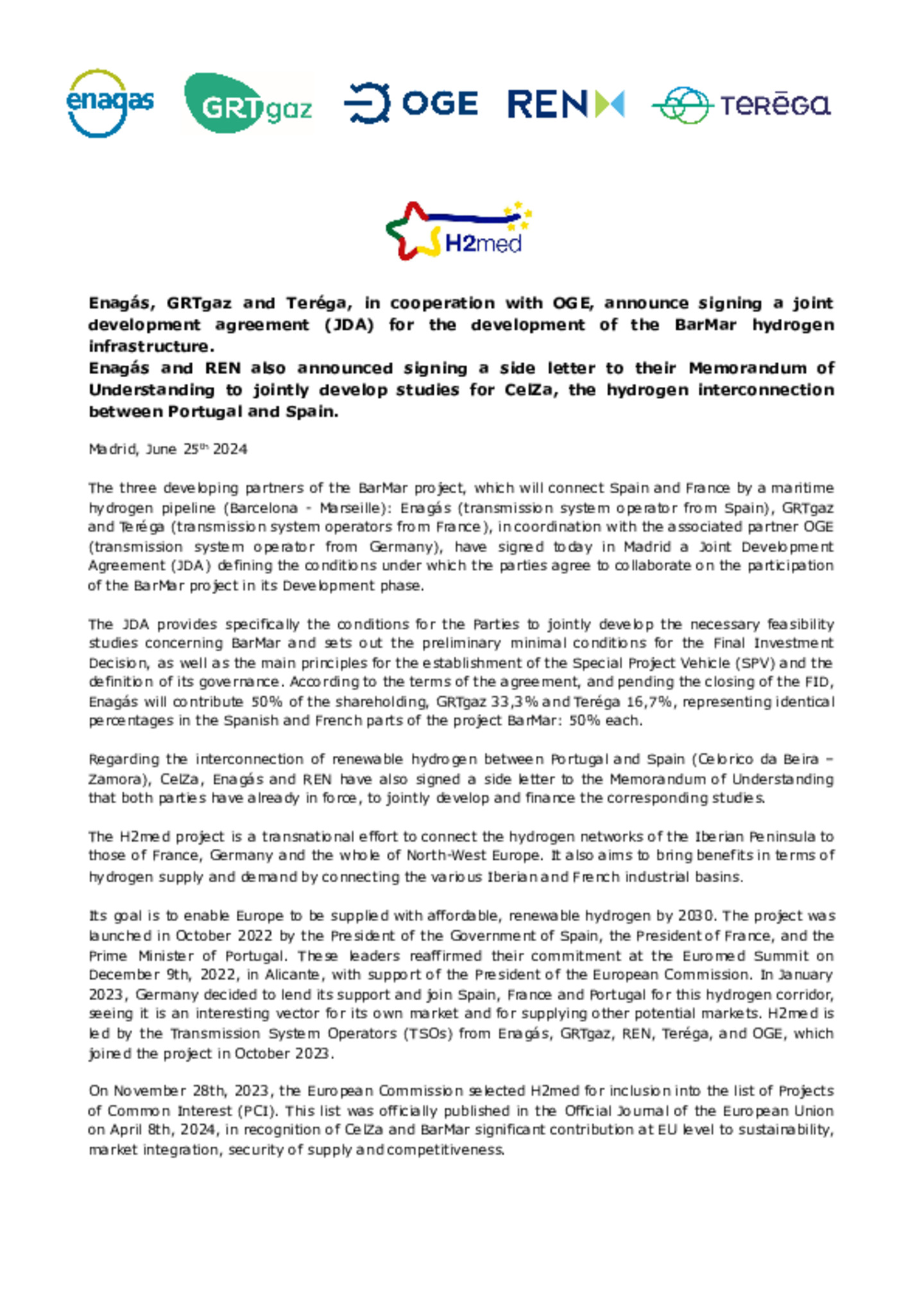 Enagás, GRTgaz and Teréga, in cooperation with OGE, announce signing a joint development agreement (JDA) for the development of the BarMar hydrogen infrastructure.